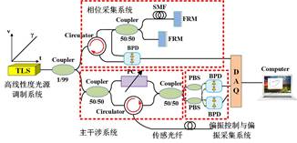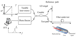 光频域反射方法的核心是采用可调谐光源实现对光频进行线性调谐。光源发出的光被耦合器分为两束,一束进入参考臂后被反射镜反射回耦合器,作为本征参考光,另一束光进入测试臂,由于测试臂的待测光纤中存在瑞利散射和菲涅尔反射,一部分光作为测试光返回到耦合器中,此时在耦合器中本振参考光与瑞利散射和菲涅尔反射组成的测试光发生拍频干涉。这里由于参考臂很短,测试臂很长,本振参考光与测试光(瑞利散射和菲涅尔反射)携带的光频是不同的,所以产生的干涉是拍频干涉。通过检测拍频信号,再通过一系列的变换就可以得到光纤分布的信息