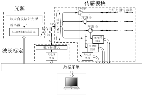 光纤光栅传感器相对传统的电传感器,如铂电阻温度传感器、电阻应变片传感器等,具有很多优势,如体积小、重量轻、不受电磁干扰、不受电荷或电流影响、灵敏度高、响应速度快、使用寿命长、测量范围广、可实现准分布式测量、传输距离远,且具有较强的可植入性,非常适合在恶劣环境中的大型工程多种指标的长期安全监测。光纤光栅传感系统已被广泛应用于桥梁健康监测、大坝健康监测、石油健康监测、油罐预警系统等大型工程中,并作为其中一个重要的发展方向,在航天航空领域得到日益广泛的关注。 系统简介: 光纤光栅温度、应变传感系统的总体结构示意图如下所示。可调谐光源由放大自发辐射光源和法珀可调谐滤波器组成,使用法珀标准具对波长进行标定。光纤分束器、光纤环形器、准分布式串联的光纤光栅传感器及光电探测器构成了传感模块。可调谐光源首先通过光纤分束器将光源分为多通道并行传输的光束,每通道均可串联多个光纤光栅传感器,形成准分布式传感网,感受外界温度和应变的变化,接着通过光电探测器获取传感光信号,并转化为电信号,传输到数据采集卡,实现光纤光栅的准分布式的温度和应变传感。 系统参数: 通道数:8、16(可选) 波长范围:1525nm~1565nm 温度测量范围:-196℃~150℃ 测温不确定度:±0.5℃(@-70℃~100℃) 应变测量范围:±3000με 应变测量精度:3με